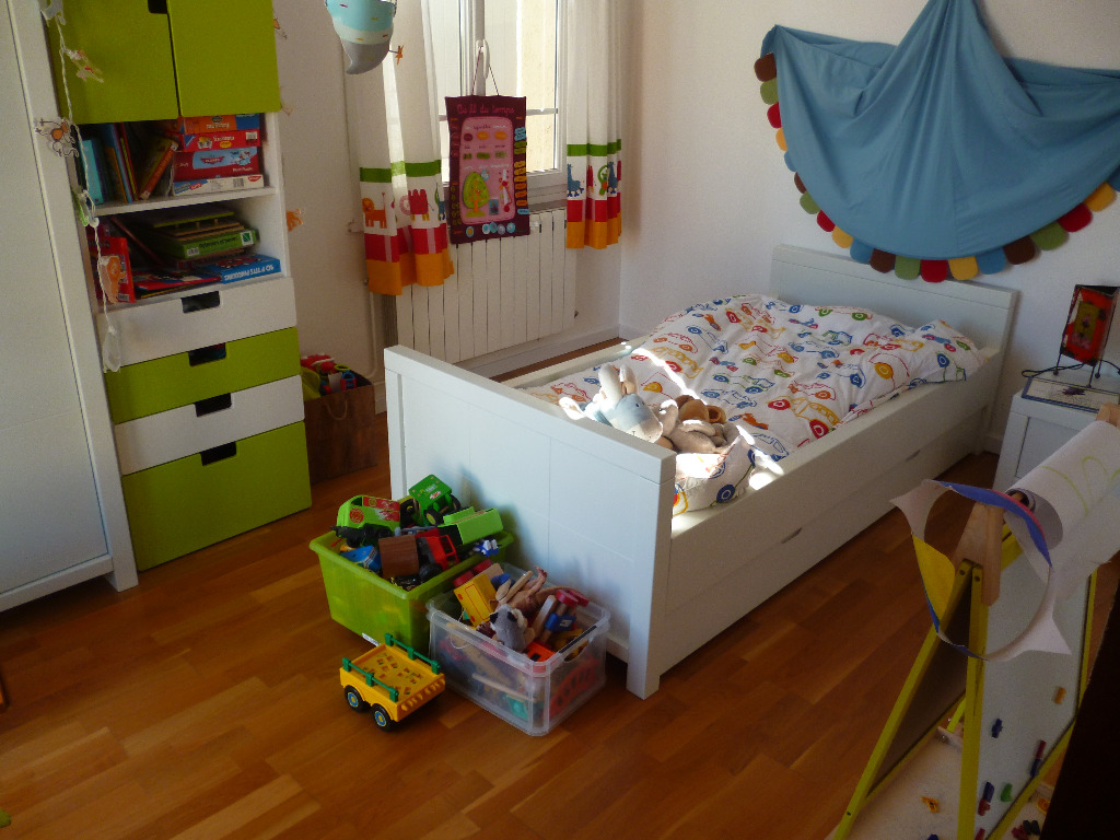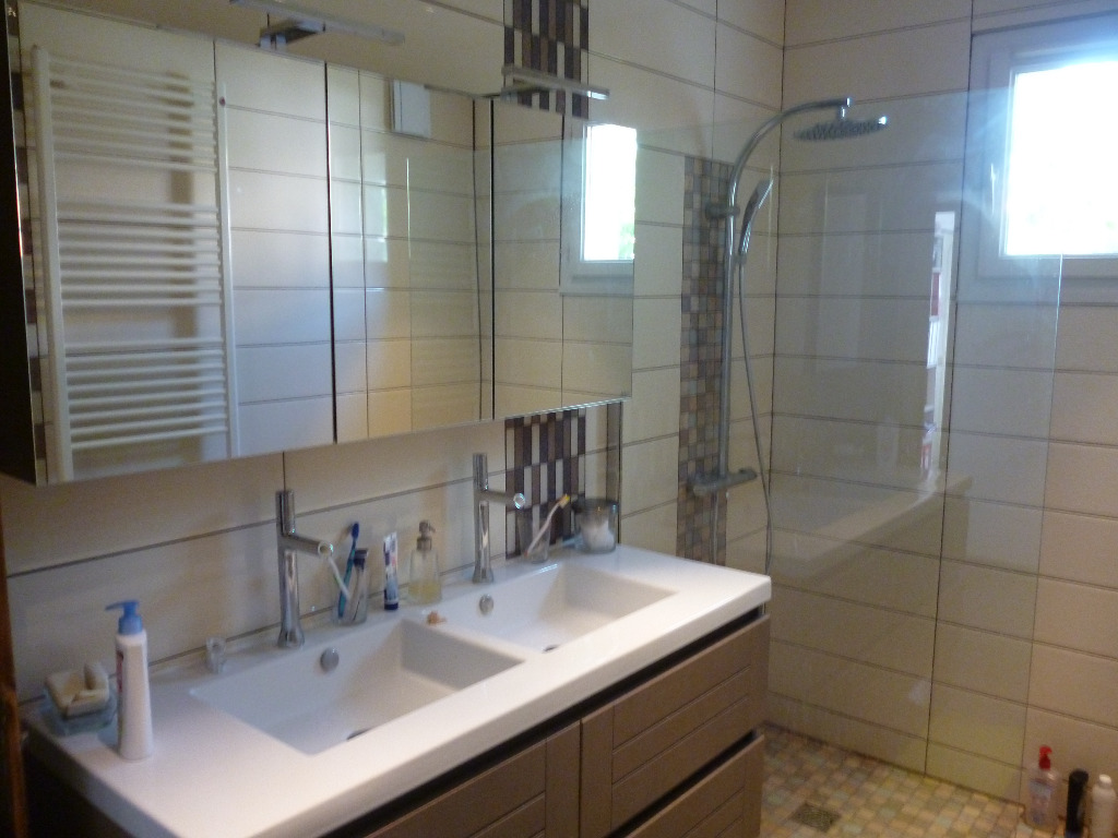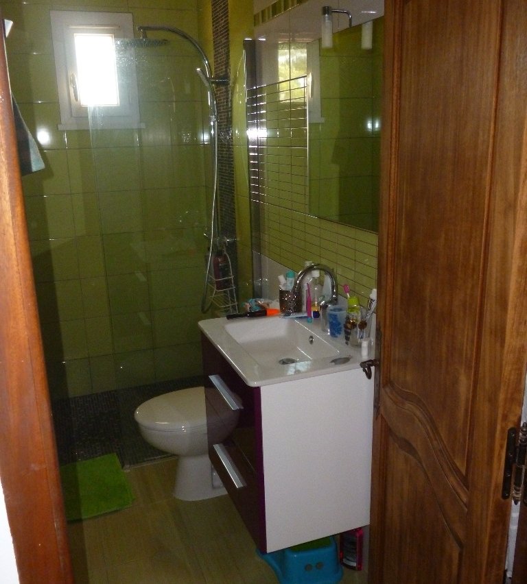 A l'étage se trouvent les chambres adultes et enfant, ainsi qu'une deuxième salle de bain avec toilettes.