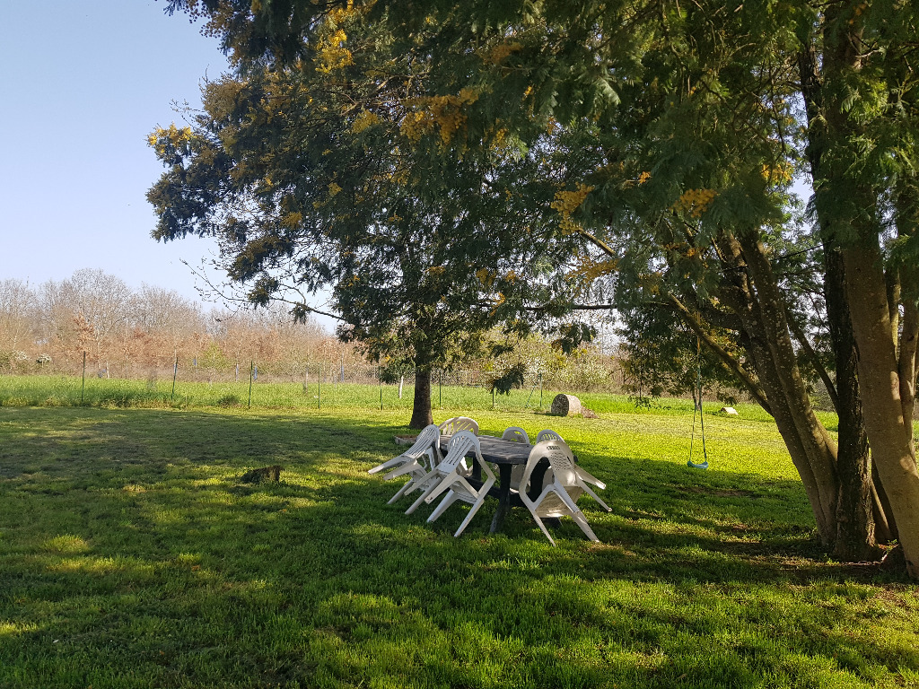 La maison est située sur un terrain d’1.5 hectares, qui offre de l’ombre en période estivale, grâce à quelques gros arbres. A votre disposition pour profiter du jardin, une table de jardin avec ses 8 chaises, ainsi que des chaises longues et canapés. S’y trouvent également une petite balançoire pour enfant, ainsi qu’un petit bac à sable. Un ancien hangar agricole offre également un abri à l'air libre.