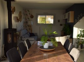 Pavillon mitoyen dans un lotissement calme, 3 niveaux : Au rez de chaussée : Un séjour-salle avec cuisine américaine, WC, buanderie, garage. Au 1er étage : les 2 chambres de nos garçons, un petit salon avec un canapé convertible, une salle de bain avec baignoire et wc. Au 2ème étage : notre chambre (lit 160), une salle de bain avec douche et wc. Coin ordinateur Le confort est “standard”: lave-linge séchant, lave-vaisselle.., barbecue, salon de jardin. Il y a un petit jardin derrière la maison, environ 150 m². 4 vélos à disposition, dont un peut être équipé d'un siège enfant.