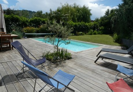 - Jardin : piscine, grande terrasse, pelouse, fleurs et quelques tomates et framboises, table de ping-pong, trampoline. Clapier à l'extérieur avec 1 lapin nain à nourrir et câliner.