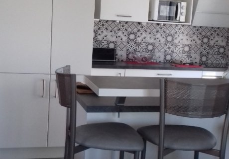 cuisine aménagée avec vue sur la salle à manger et salon.