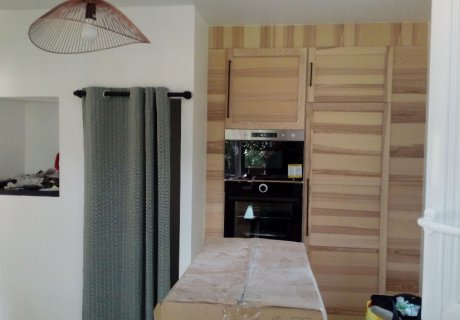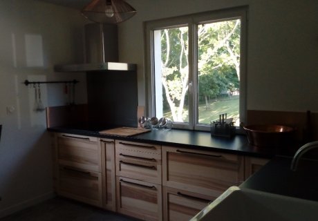 Maison individuelle, en bois, avec terrasse et grand extèrieur (donnant sur un verger et une forêt).