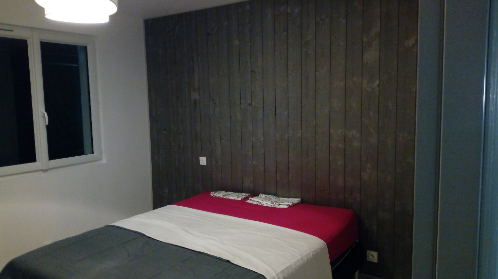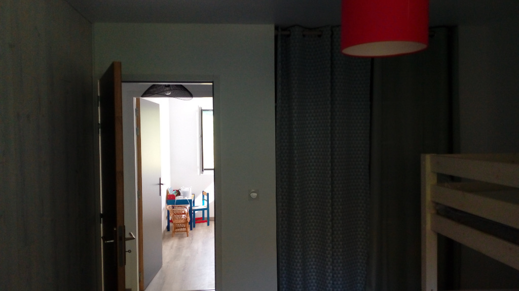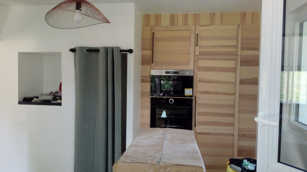 Maison individuelle, en bois, avec terrasse et grand extèrieur (donnant sur un verger et une forêt).