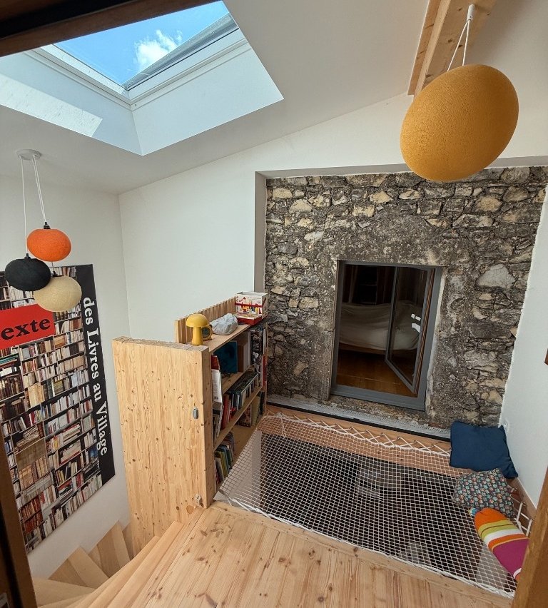 Restaurée et construite avec des matériaux écologiques, beaucoup de bois, la maison est très confortable.