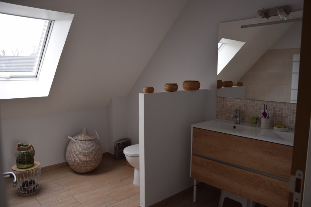 La maison est récente. Située sur un terrain de 600m², elle offre 120m² d'espace intérieur : une suite parentale avec une grande douche, 3 chambres d'enfants spacieuses, une cuisine ouverte, une seconde salle de bain, une buanderie et un garage. Une grande mezzanine offre un espace de jeux supplémentaire.