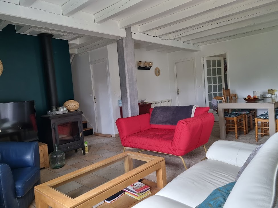La maison se compose d'une cuisine indépendante, une salle à manger salon qui donne sur la terrasse, 3 chambres et un garage. J'habite en campagne sur une colline qui permet d'avoir de belles vues. L'environnement est très calme.