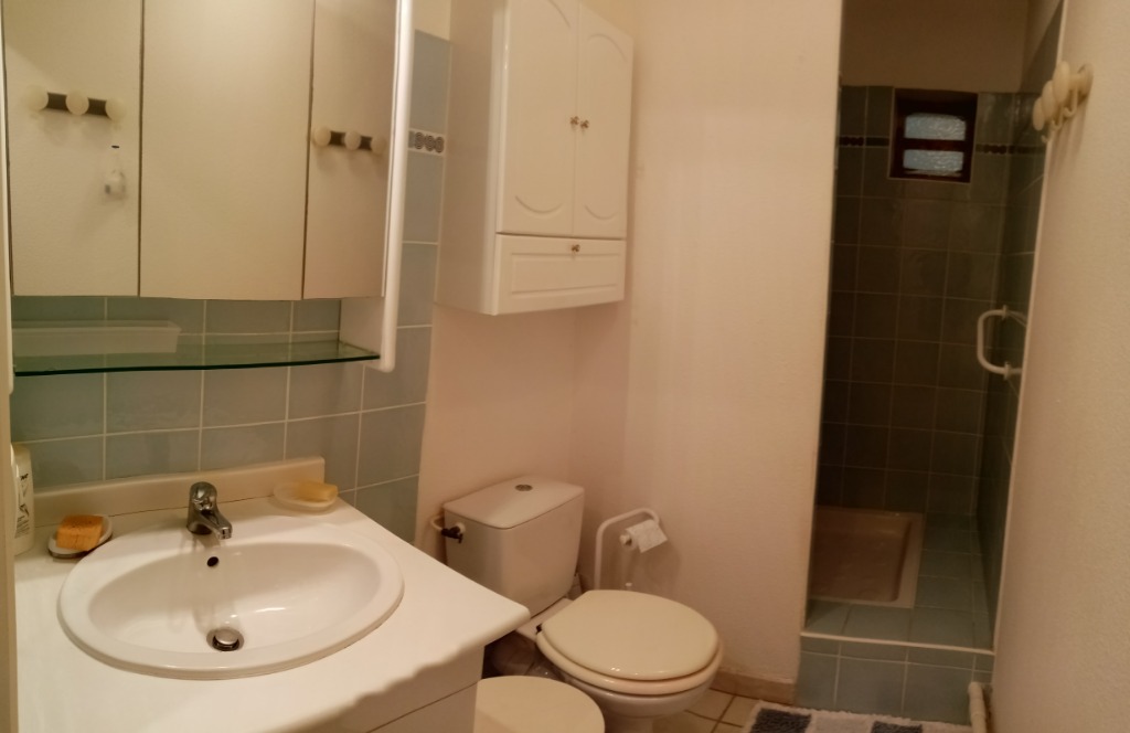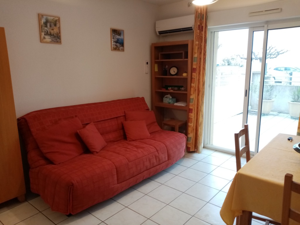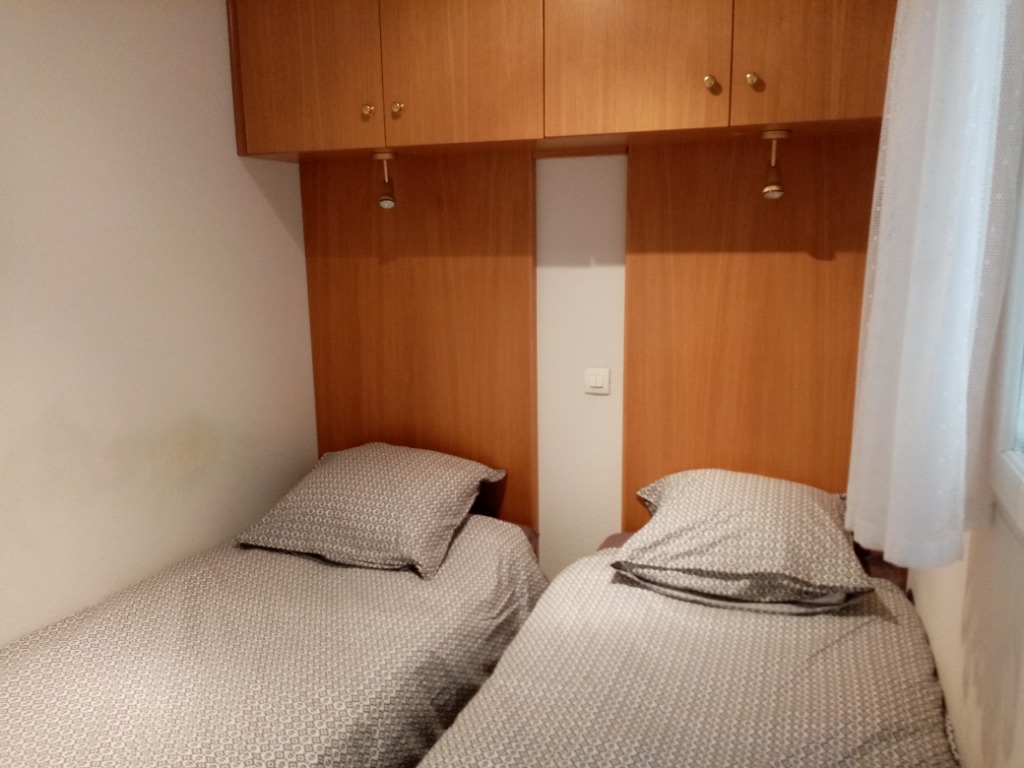 L'appartement se compose d'une pièce de vie avec cuisine équipée, salon avec canapé clic clac, télévision qui donne sur une terrasse spacieuse ou l'on peut manger, il y a également la climatisation réversible dans le salon ainsi qu'un store qui est agréable l'été. La chambre est en fait une cabine fermée (donc petite) avec deux lits simple mais elle se ferme et il y a une fenêtre et c'est très tranquille même en été.