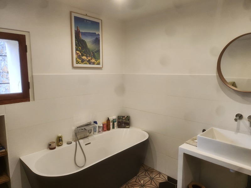 4 chambres direct + 1 supplémentaire en couchage simple; 2 SdB, 1 salle à manger extérieure en terrasse couverte, et plusieurs terrasses en pierre.
