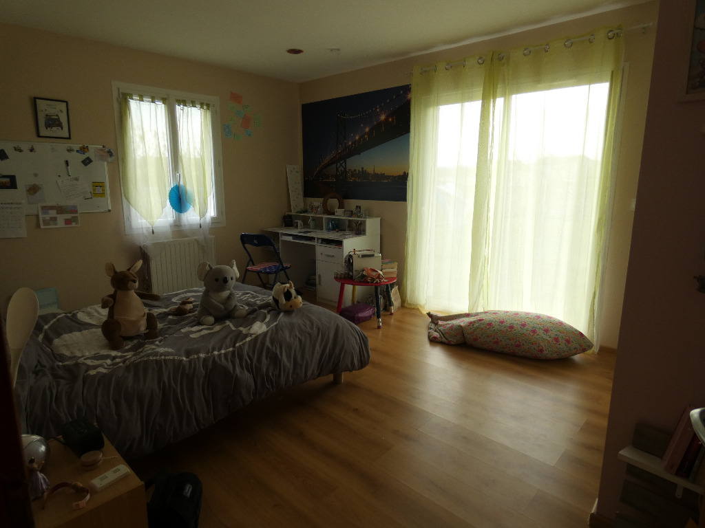 Single storey house with a mezzanine; a kitchen overlooking the living room, dining room. 4 bedrooms, a bathroom, a mezzanine (desk and reading area), a garden with games for children.