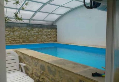 Terrain clôturé et arboré de 300 m2, piscine en pierre semi enterrée avec accès sécurisé et abri rétractable permettant de s'y baigner les jours pluvieux.