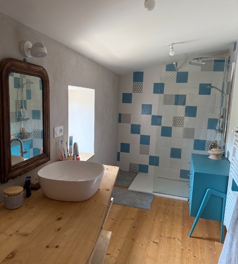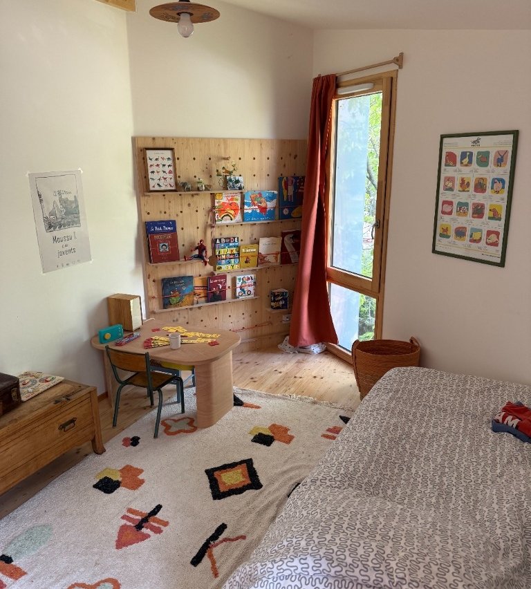 Restaurée et construite avec des matériaux écologiques, beaucoup de bois, la maison est très confortable.