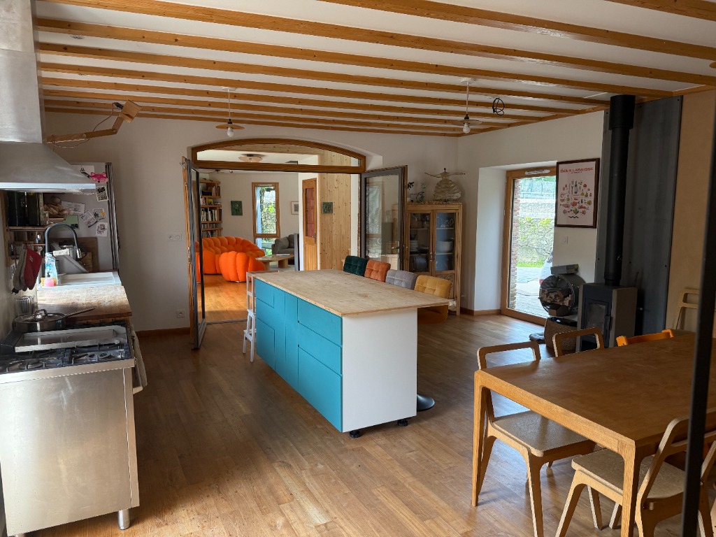 Elle se compose d'une grande cuisine, salon, de 3 chambres, 2 salles de bains, 2 grandes terrasses en bois et d'un jardin (600m² environ avec trampoline, cabane pour enfant ...)