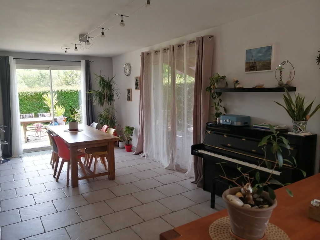 - une cuisine équipée et un grand séjour-salle à manger ouvrant sur un jardin et une terrasse couverte
