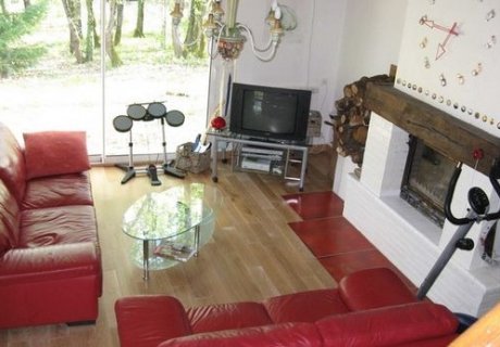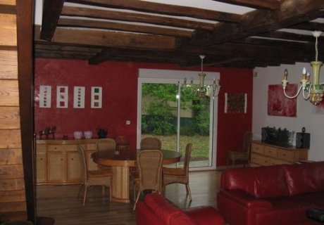 Elle fait 135 m2 et se compose de deux niveaux. Au rez de chaussée le garage, le cellier, la cuisine, une grande salle à manger (45 m2), W.C., une salle de bain et deux chambres. A l’étage, deux autres grandes chambres et une salle de bain + W.C., un sauna. Devant une terrasse ouverte sous les arbres avec barbecue donne directement sur la cuisine et la salle à manger. Cette dernière possède un grand poêle à bois.