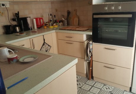 Sejour, chambre lit 1.6m, salon canapé 2pl, cuisine séparée, sdb, wc séparé, 2 jardins de 50m2, cave, garage ssol