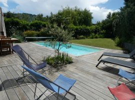 Notre maison est une maison de village. Elle a une surface de 120 m2, avec une cuisine ouverte sur une grande salle à manger, une mezzanine qui nous sert de salon, trois chambres (deux chambres avec un lit deux places et une chambre avec un lit une place). Nous avons deux terrasses, une devant la cuisine, celle où nous mangeons, et une qui donne devant les chambres des enfants avec une vue magnifique sur nos montagnes!