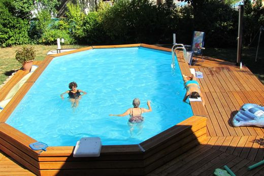 Devant la maison se trouve une piscine en bois semi-enterrée chauffée au sel, et une pompe à chaleur. Accès à la piscine directement de la maison par la terrasse.