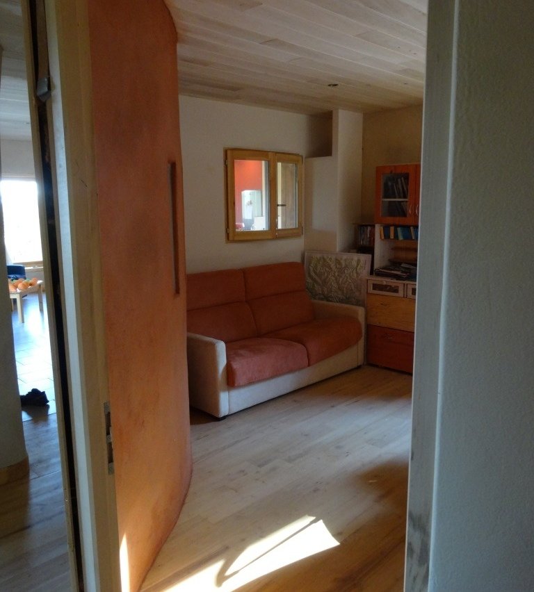 Grande pièce de vie avec cuisine ouverte, terrasse sud et terrasse ouest, poele à bois bûche, brasseur d'air.