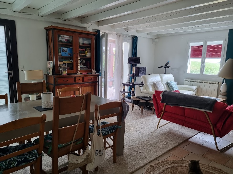 La maison se compose d'une cuisine indépendante, une salle à manger salon qui donne sur la terrasse, 3 chambres et un garage. J'habite en campagne sur une colline qui permet d'avoir de belles vues. L'environnement est très calme.
