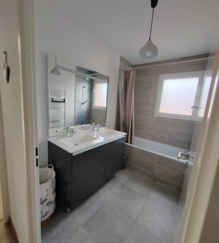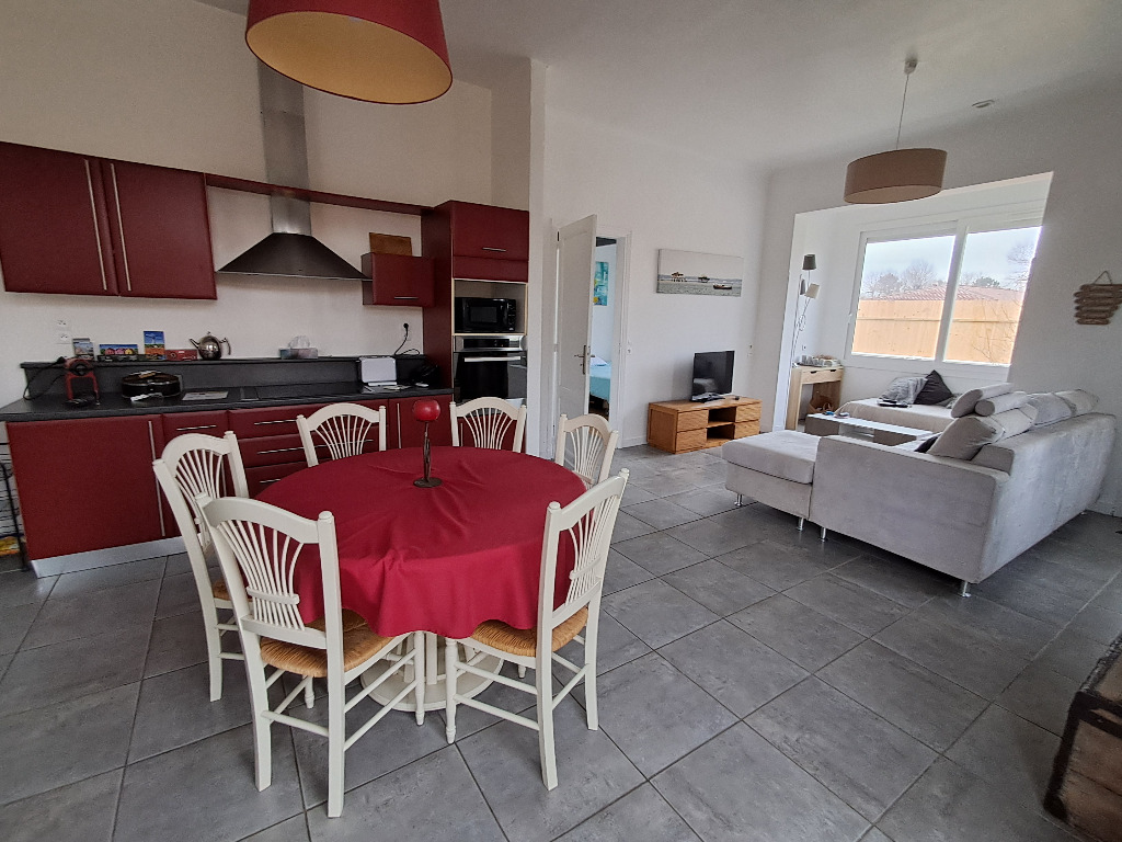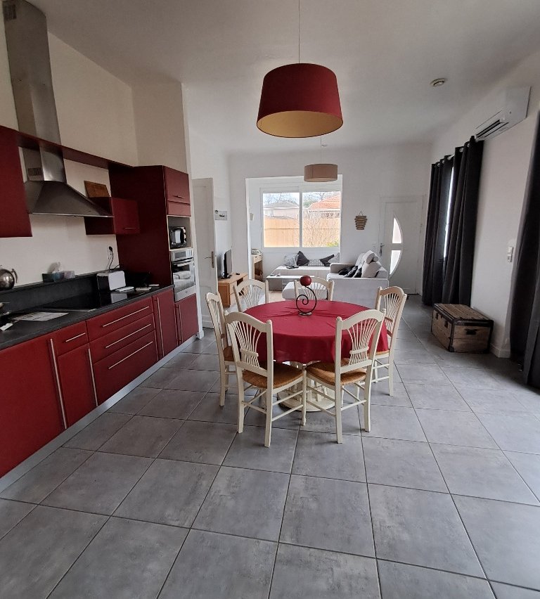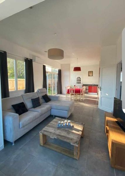 Maison avec jardin, 3 chambres dont 2 avec lit king size et 1 avec un lit double, 2 douches et 2 WC, salon et cuisine équipée. Salon de jardin et vélos, barbecue.