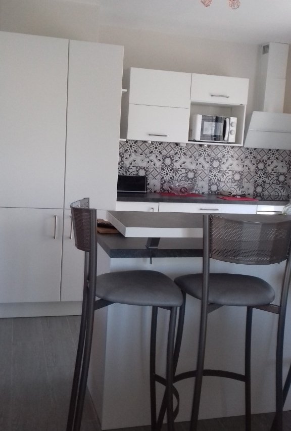 cuisine aménagée avec vue sur la salle à manger et salon.