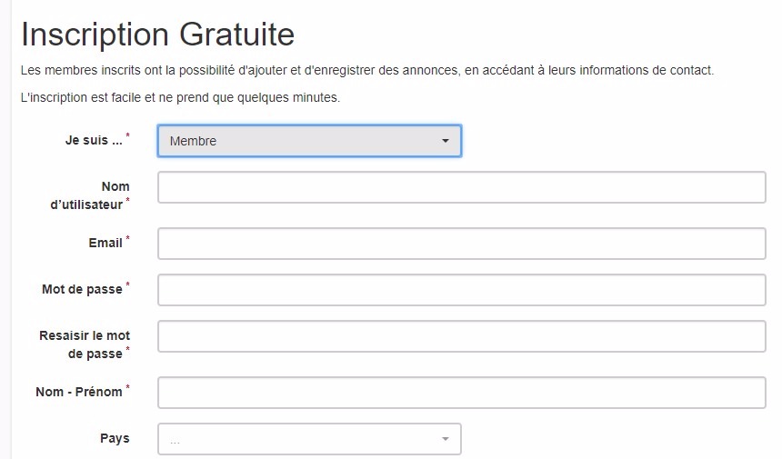 2 - S’inscrire en tant que membre : Commencer par vous inscrire en tant que membre. Attention ! Toutes les rubriques marquées d’un * sont obligatoires. A ce stade-ci, rien ne vous sera demandé concernant les détails du logement que vous voulez échanger.