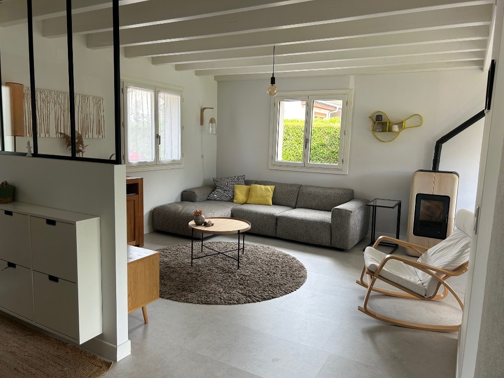 Maison lumineuse de ~ 120 m2 sur jardin clôturé de 1000 m2. Terrasse exposée sud avec mobilier de jardin, grande pelouse, piscine hors sol.