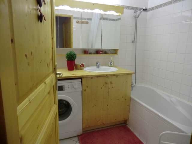 Salle de bains : Baignoire, machine à laver, armoire à toilette.