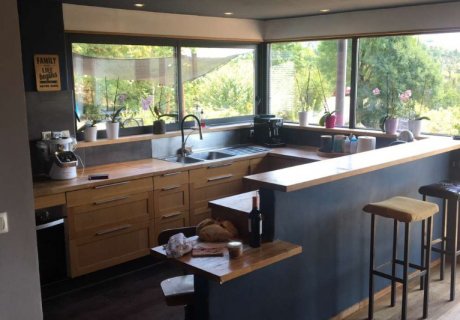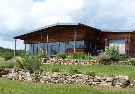 Maison écologique composée de 5 chambres (10 couchages + 4 à 5 couchages sur canapés), une salle de bain, une salle d'eau, un grand séjour/salon/cuisine. Maison ouverte sur l'extérieur et la campagne environnante grâce à ses baies vitrées qui font la totalité de la maison.