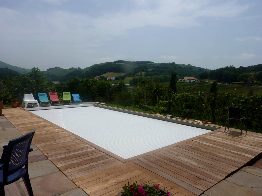 Une piscine enterrée de 4m X 8m sécurisée par un volet roulant électrique sur la terrasse. 1,40m de profondeur partout