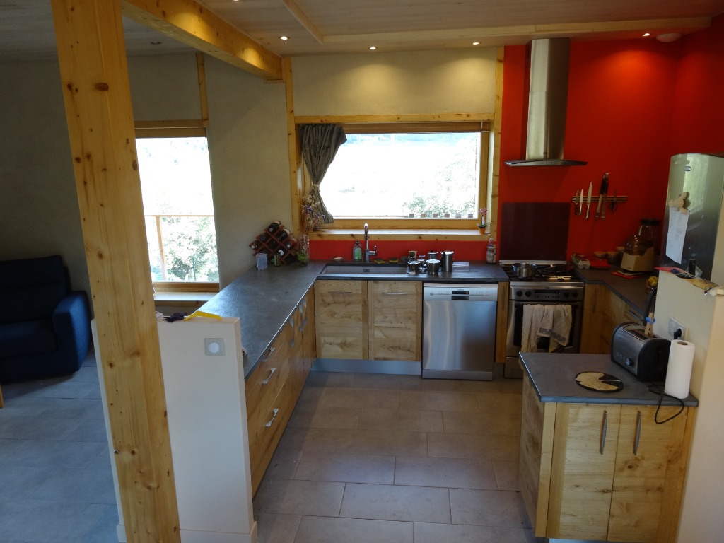Grande pièce de vie avec cuisine ouverte, terrasse sud et terrasse ouest, poele à bois bûche, brasseur d'air.