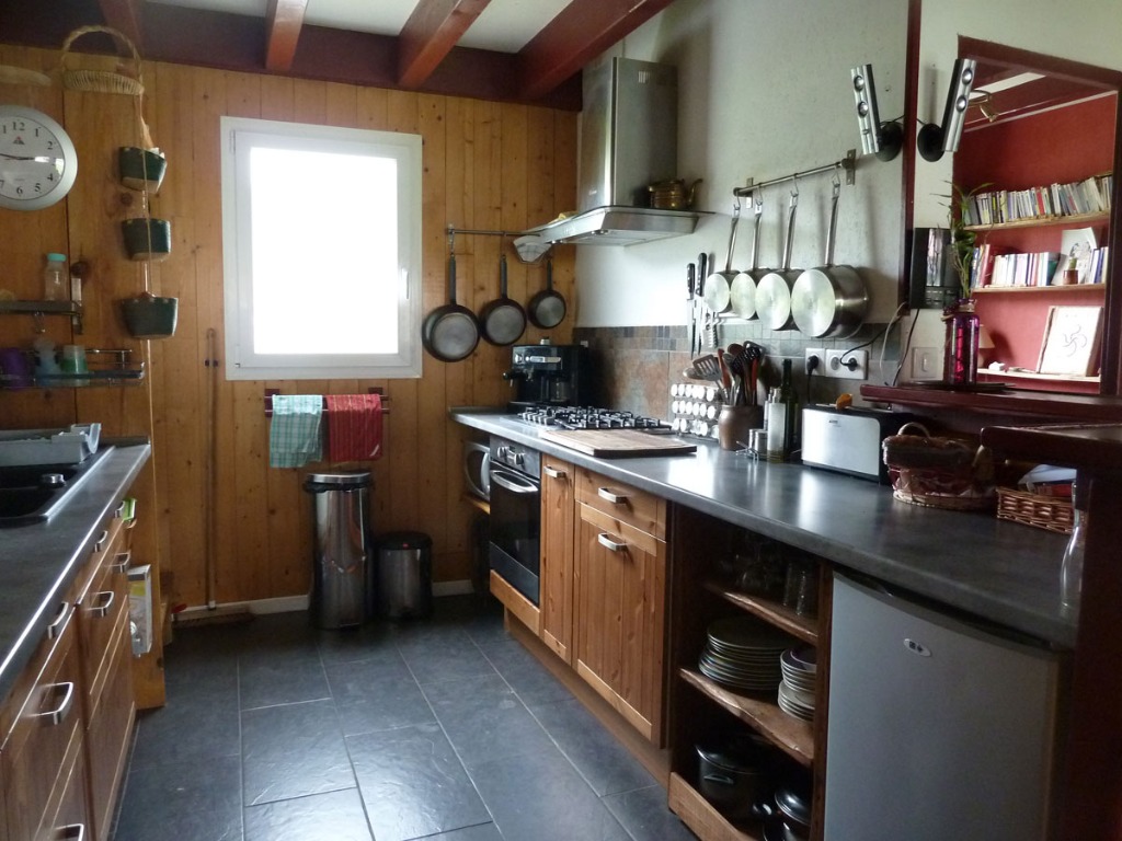 Un espace de vie avec cuisine équipée (feux gaz, micro ondes), salle à manger et coin salon avec poêle à bois.