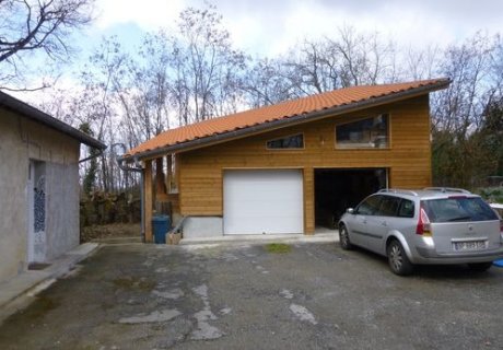 Autour il y a un accès direct sur une petite route. Une cour privée permet de stationner plusieurs voitures. Dehors, un grand garage ossature bois. Devant la maison se trouve une grande piscine en bois, chauffée avec une pompe à chaleur, très agréable en été.
