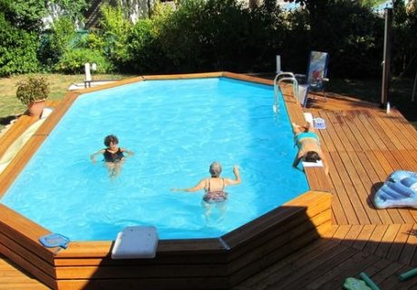 Devant la maison se trouve une piscine en bois semi-enterrée chauffée au sel, et une pompe à chaleur. Accès à la piscine directement de la maison par la terrasse.