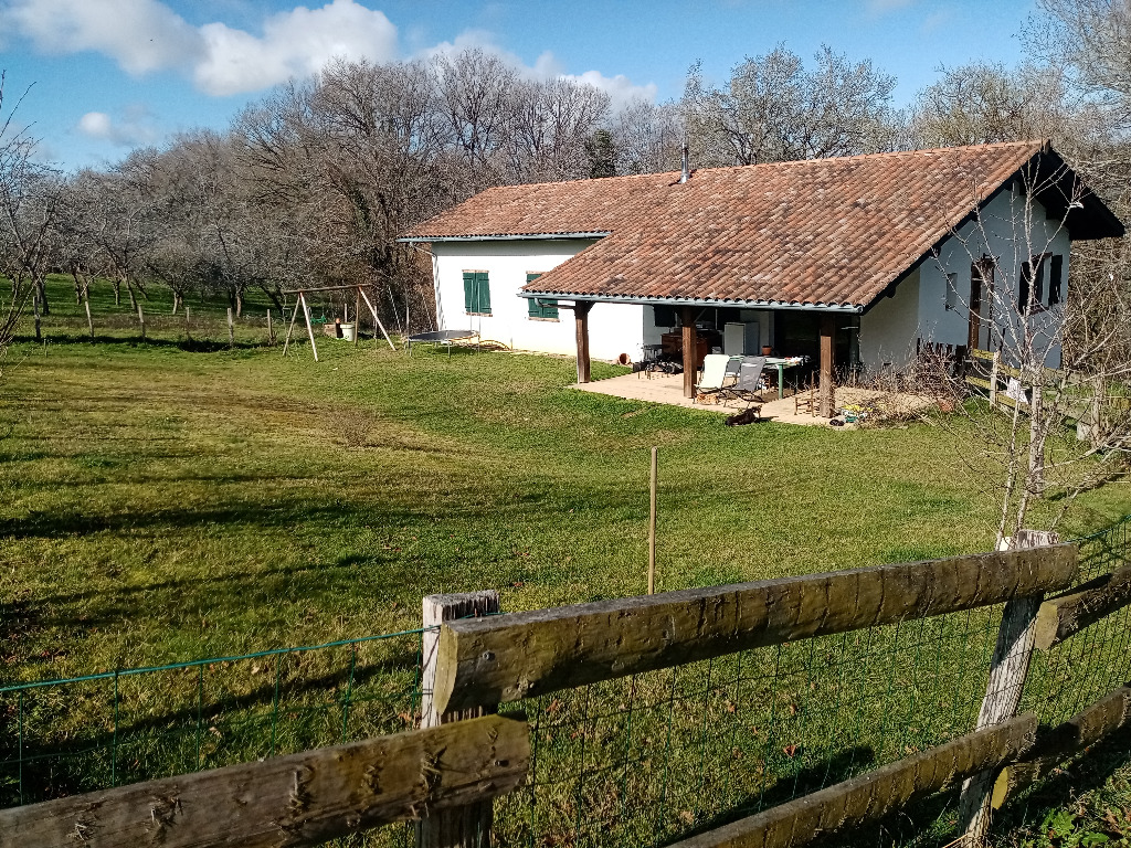 Maison individuelle, en bois, avec terrasse et grand extèrieur (donnant sur un verger et une forêt).