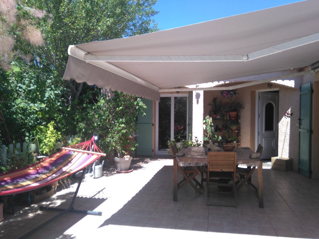 A l'extérieur, vous trouverez une grande terrasse d'environ 50 m2 avec un petit porche et un store motorisé, vous permettant de vous abriter du chaud soleil d'Ardèche en été ! Vous pourrez profiter de longues veillées sur celle- ci puisqu'elle est équipée d'une table en bois exotique avec ses 4 chaises assorties, 2 transats avec leur matelas, un barbecue à charbon, des éclairages automatiques la nuit et important si vous avez des enfants en bas- âge, une barrière en bois avec 2 portillons sécurisés. Il y a aussi un garage attenant où vous pourrez garer une voiture.